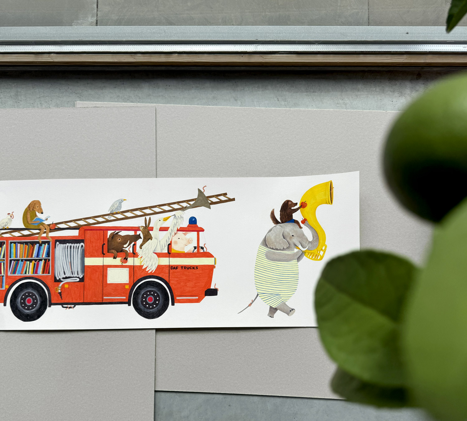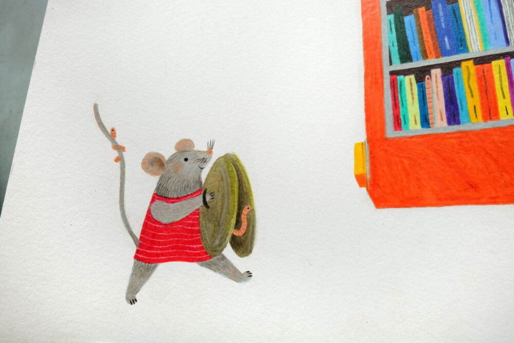 Originele illustratie geïllustreerd met zwarte balpen en kleurpotloden op 300 grams ongestreken, gebroken wit Munken papier van Arctic Paper. Het formaat is 95 x 31,3 cm.