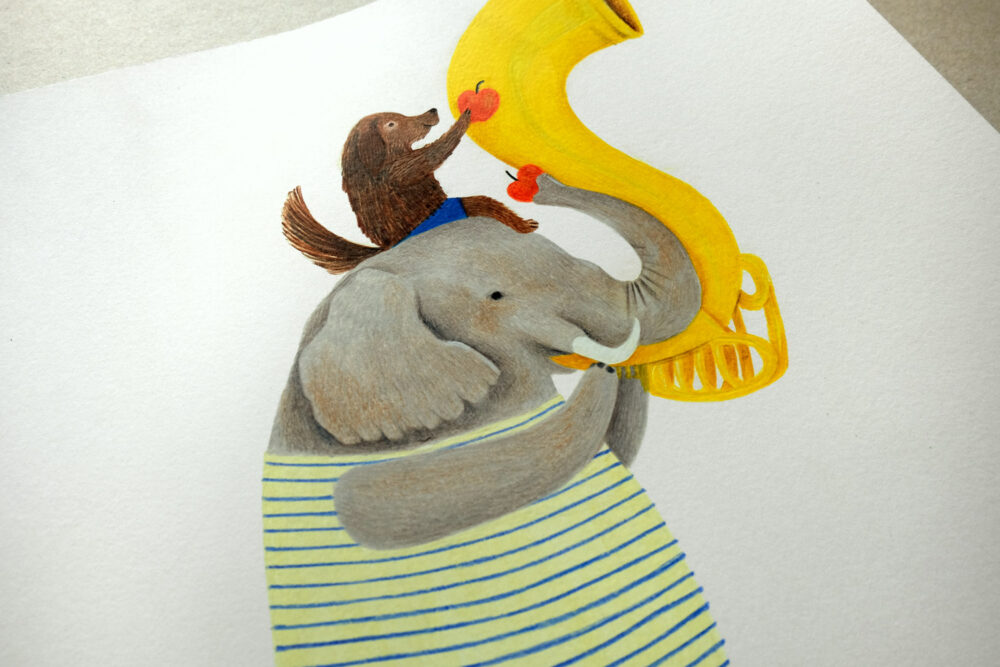 Original illustration, illustrated with black ballpoint pens and colored pencils, on 300 grams, uncoated, off white Munken paper from Arctic Paper. The size is 95 x 31,3 cm.