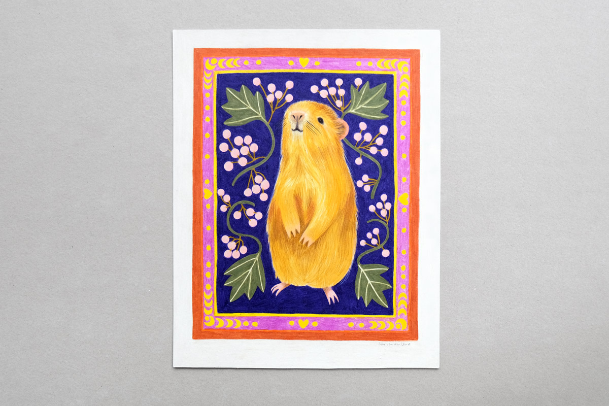 Originele illustratie geïllustreerd met kleurpotloden op 300 grams ongestreken, gebroken wit Munken papier van Arctic Paper. Het formaat is 28,3 x 35,8 cm.