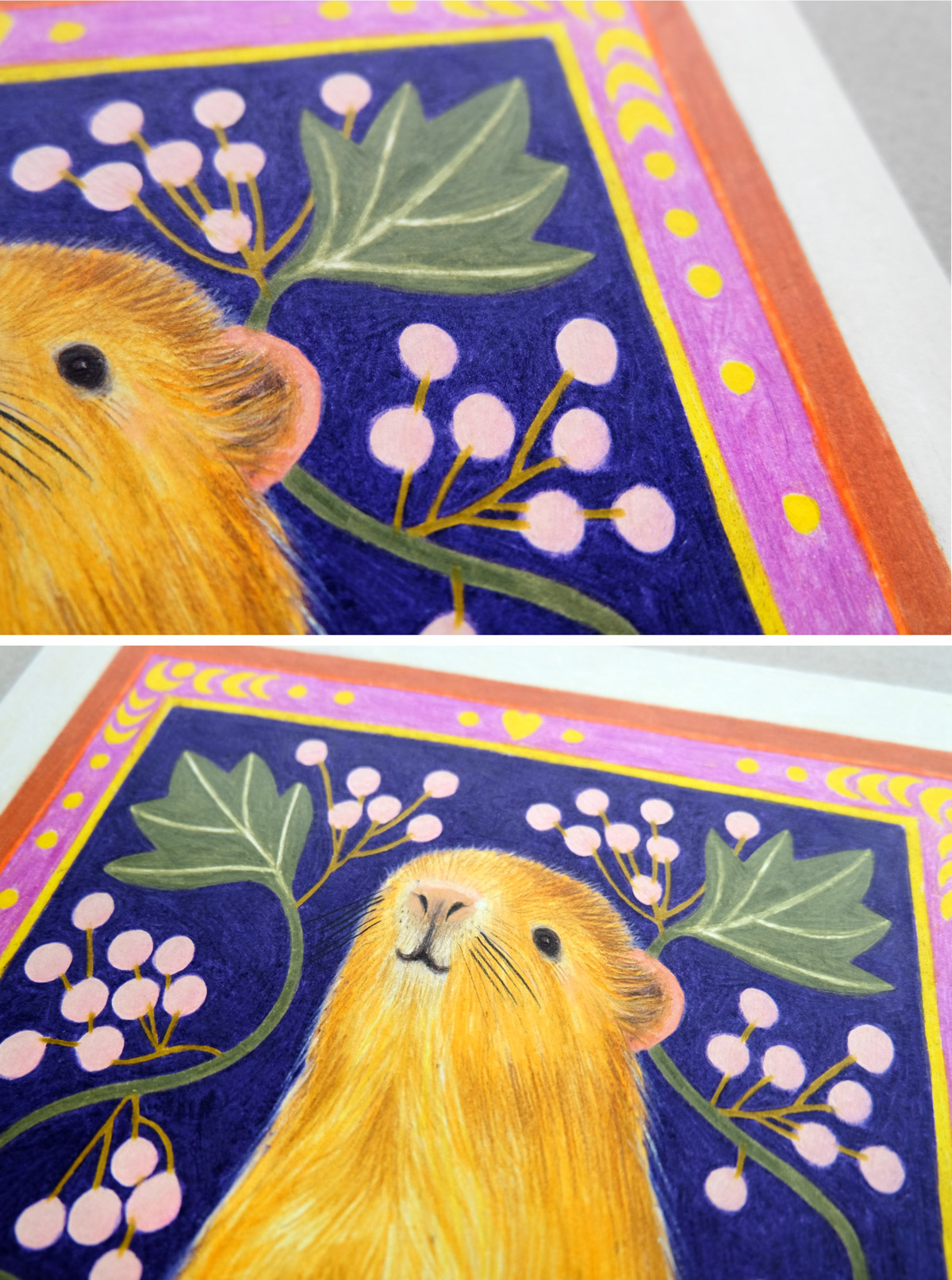 Original illustration, illustrated with colored pencils, on 300 grams, uncoated, off white Munken paper from Arctic Paper. The size is 28,3 x 35,8 cm.
